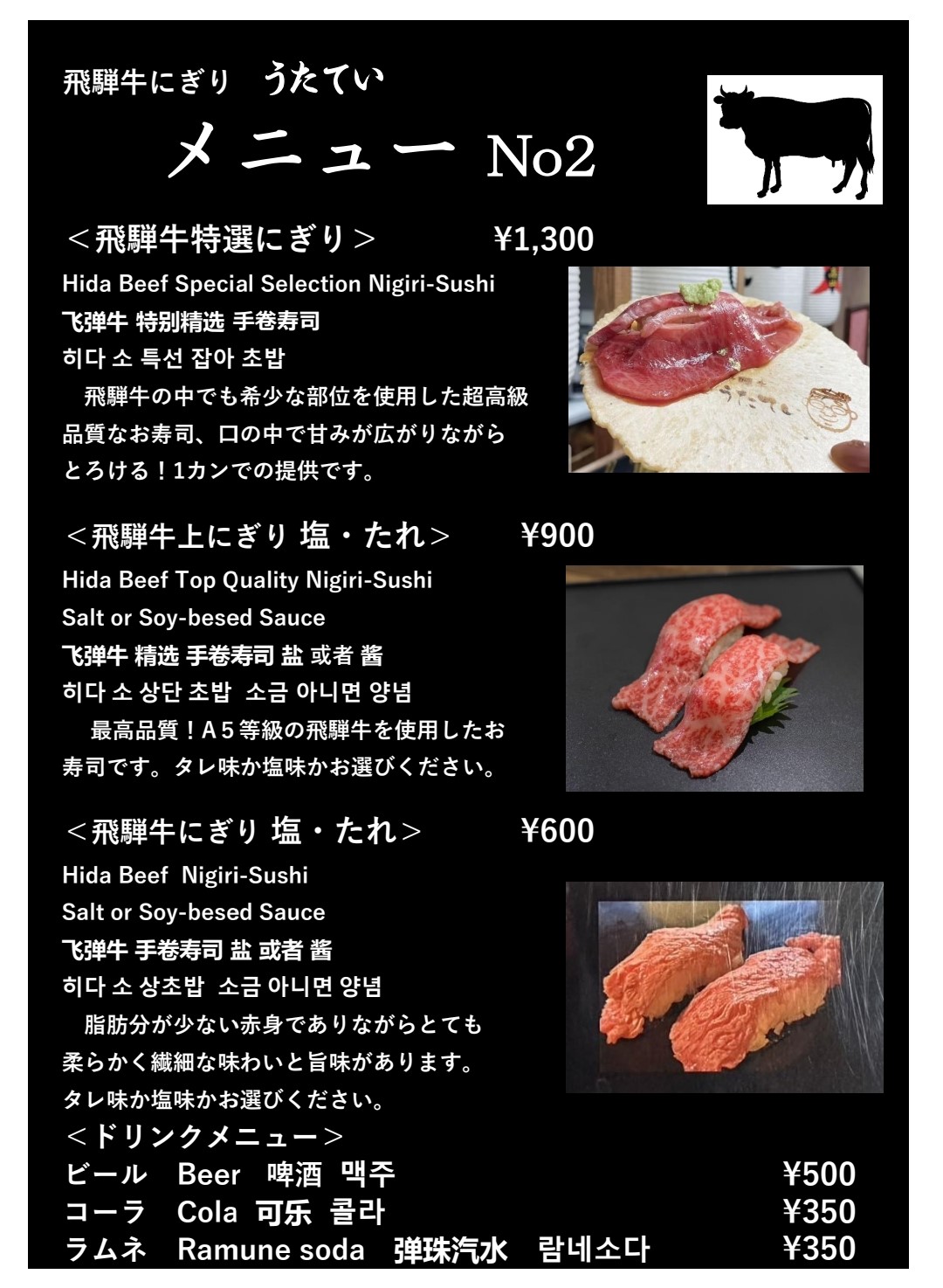 飛騨牛にぎり 600円飛騨牛上にぎり 900円