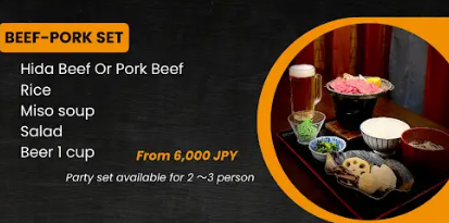 飛騨牛のセットメニュー 6000円居酒屋の単品メニューなど多数