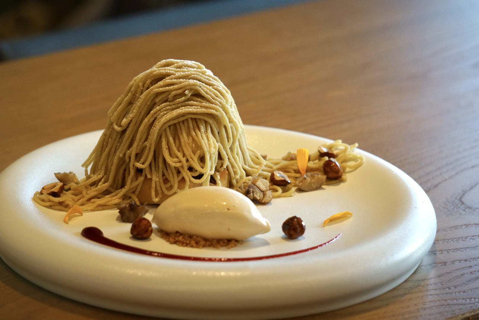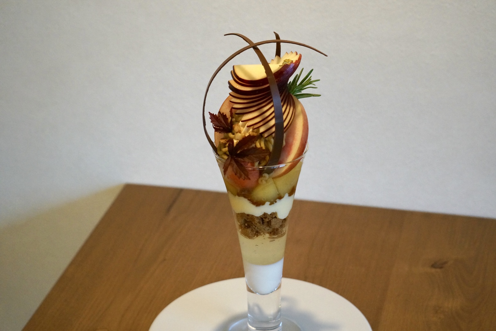 アシェットデセール:モンブラン(恵那栗、燻製アイス、メレンゲアイス)パフェ:パフェ・オ・ポム(飛騨リンゴ3種、パプリカとフランボワーズのアイス、カルダモンアイス)