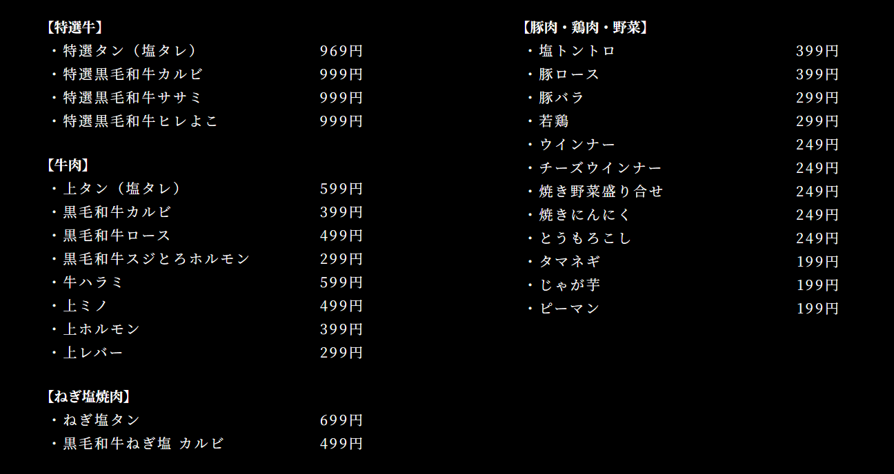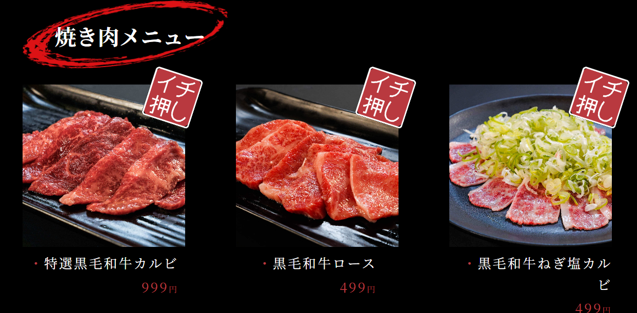 ①黒毛和牛かるび399円②生ビール399円