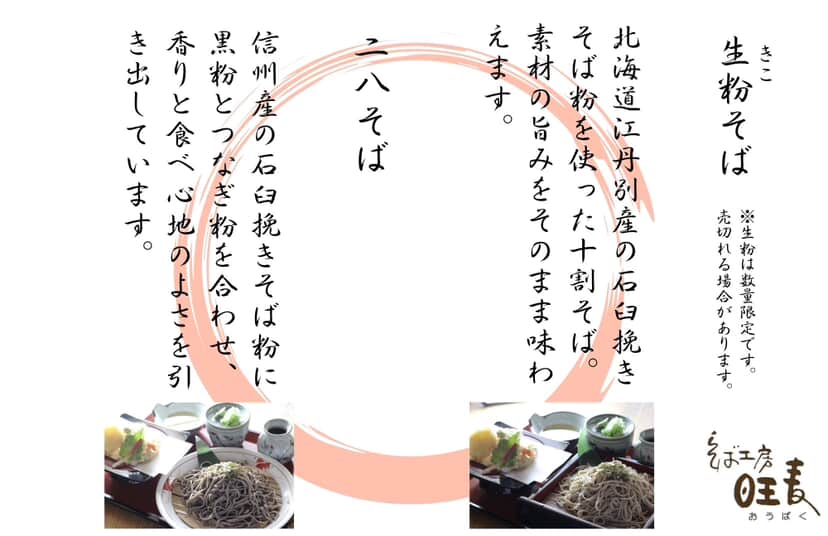 「そば工房旺麦」は、生粉そば(十割そば)に北海道江丹別産の石臼挽きそば粉を使用し素材の旨みをそのまま味わえます。