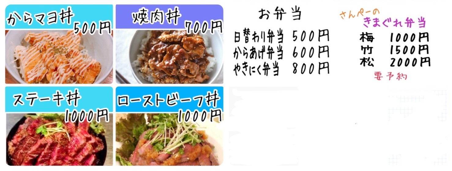 時々お休みにするときが有りますので、LINE(ID・chiryu0708)にて注文承ります。メニュー