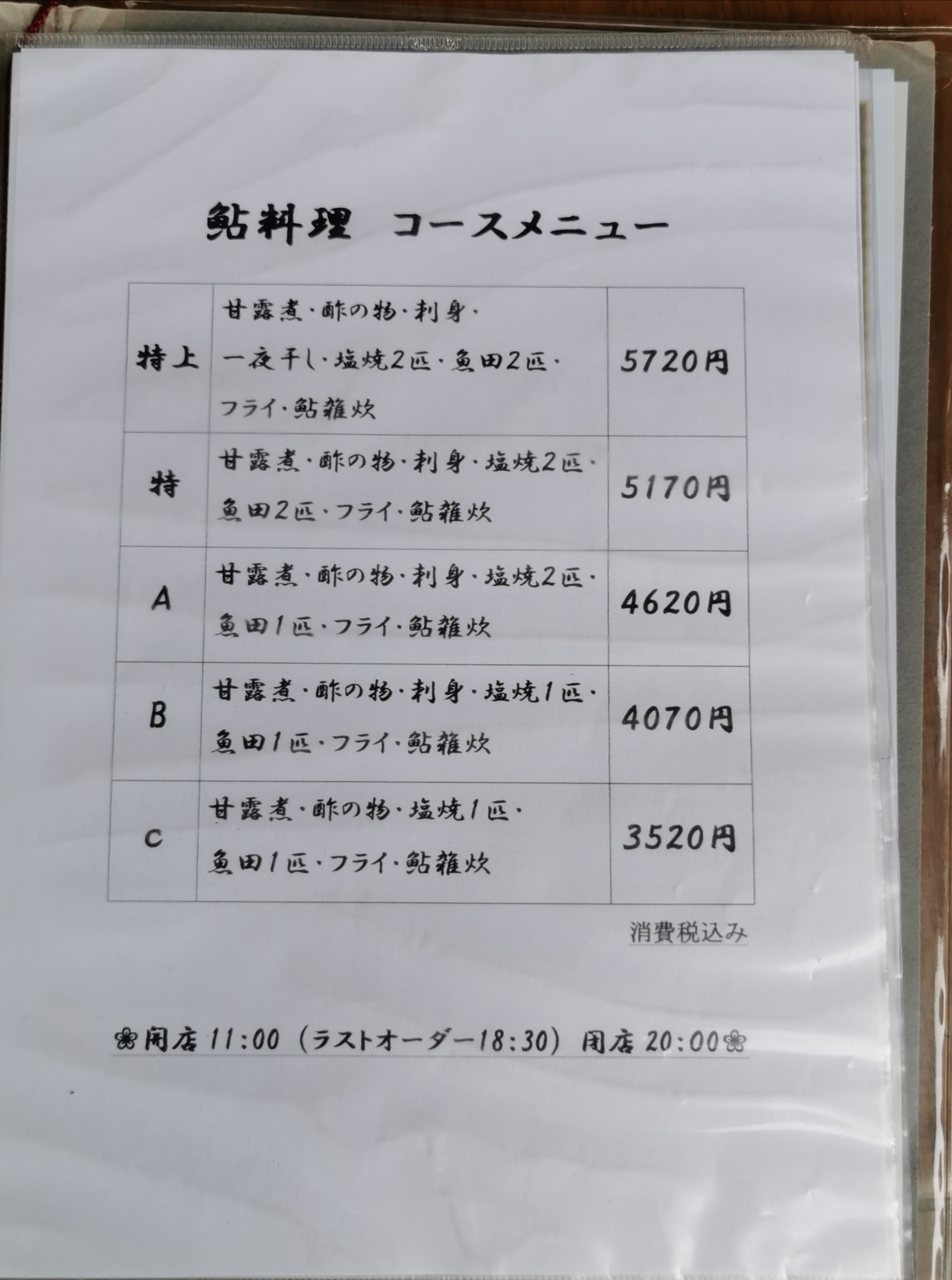 大正3年創業の老舗。鮎を立てて炭火の遠火でじっくり焼き、腹・背・両側面と4方向より火を入れることにより外はカリッとした食感で、鮎の旨みや適度な油が皮でしっかりと閉じ込められています。創業大正3年より守り続けられてきたこだわりです。コース料理は、塩焼きや魚田 ( 味噌田楽 )、揚げ物、酢物、赤煮 ( 甘露煮 )、雑炊など多彩な内容。コースによっては、お刺身や活鮎の一夜干しなど多彩なお料理をご用意しております。