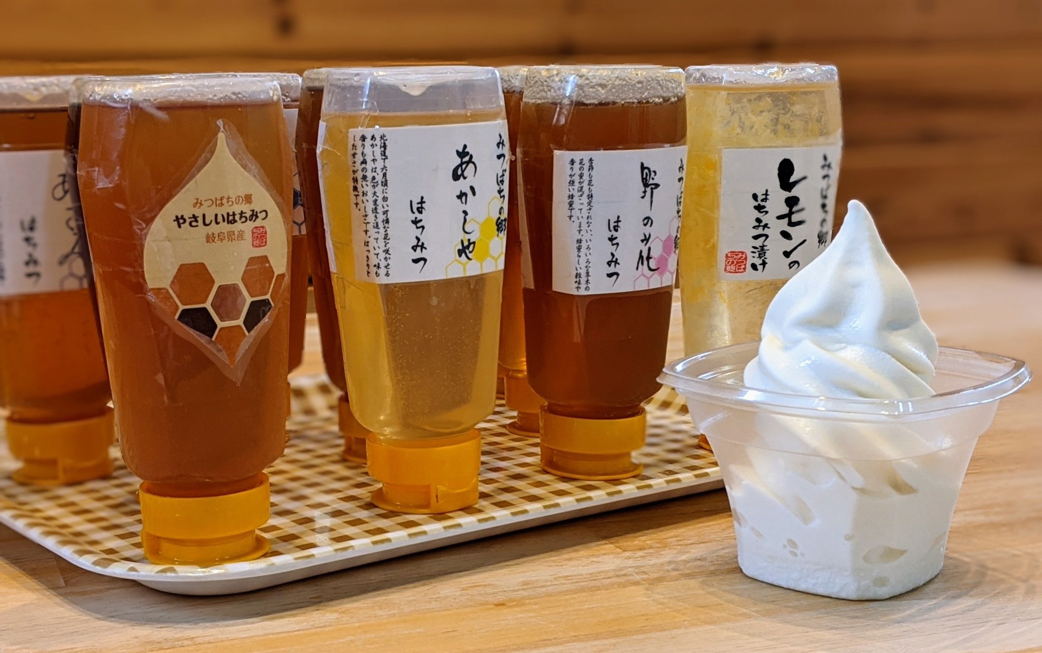 国産はちみつと飛騨牛乳でつくったこだわりのはちみつソフトクリームはテイクアウト大人気商品ですが、店内で食べる場合はお好きなはちみつをかけ放題で食べることができます。