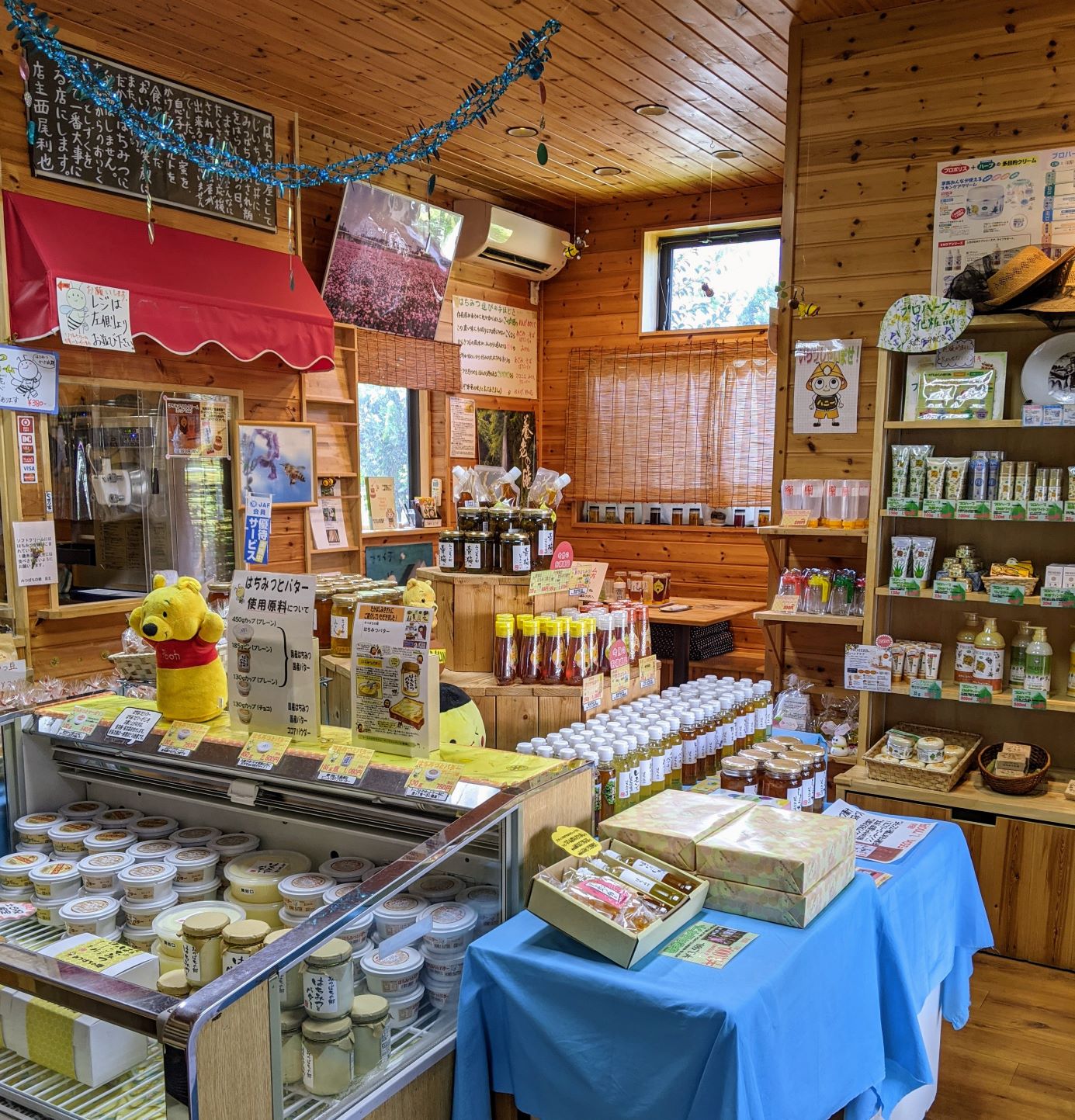 はちみつ工場の敷地内にある直営店で、岐阜県産など国産はじめ各国のはちみつが常時そろっています。