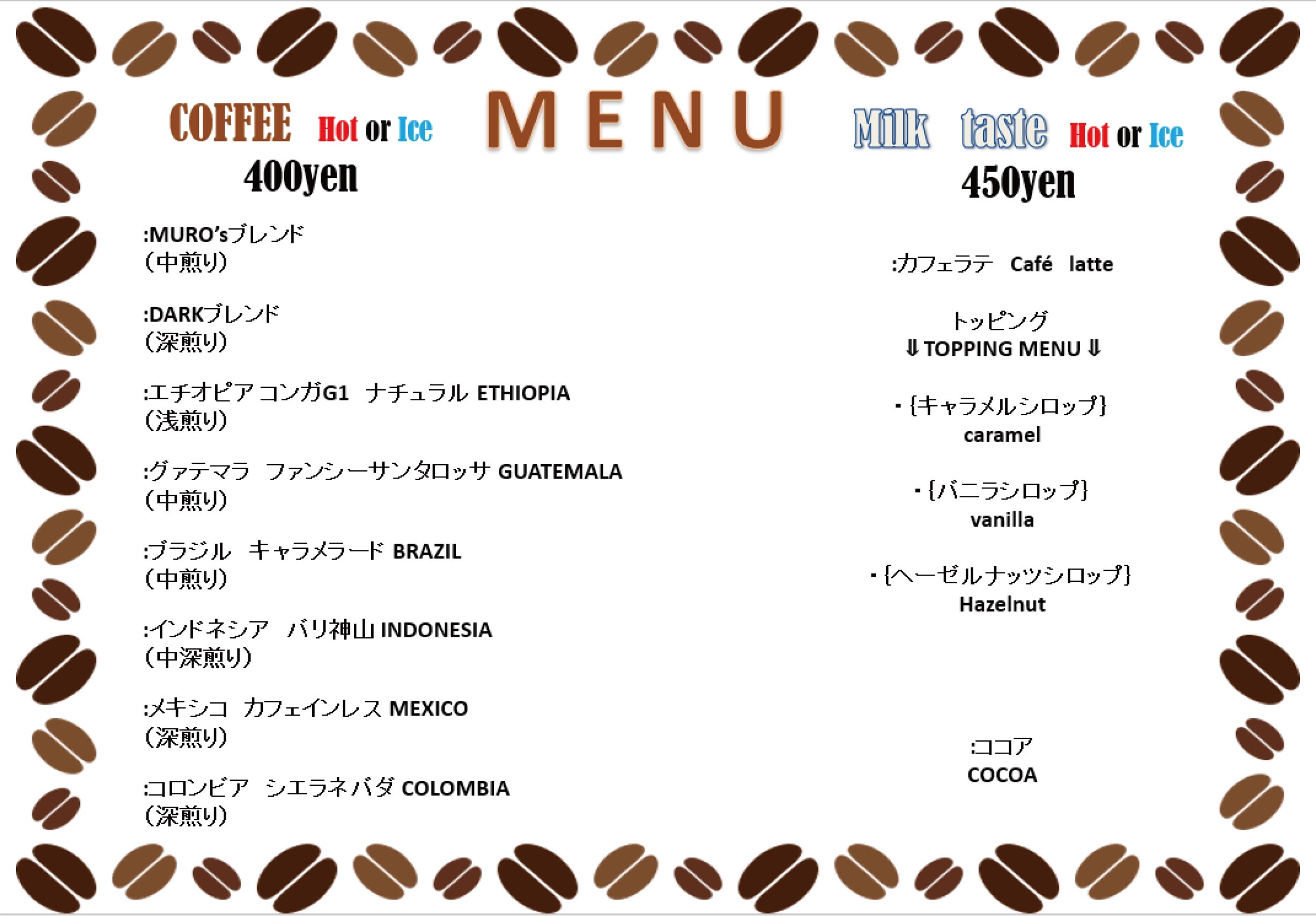 コーヒー8種類 ( ICE or HOT ) /400円カフェラテ ( ICE or HOT ) /450円