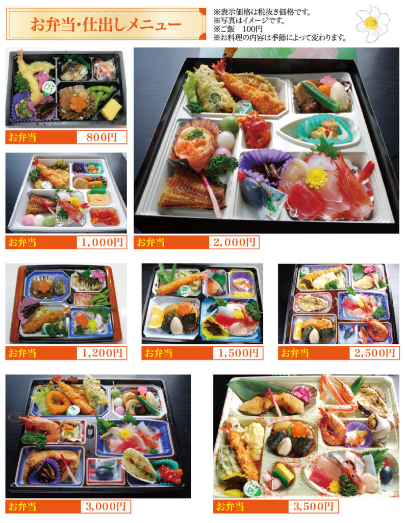 和食 魚料理 お弁当 野菜・果物 飲料 食材提供 ランチ ディナーご予約・設備