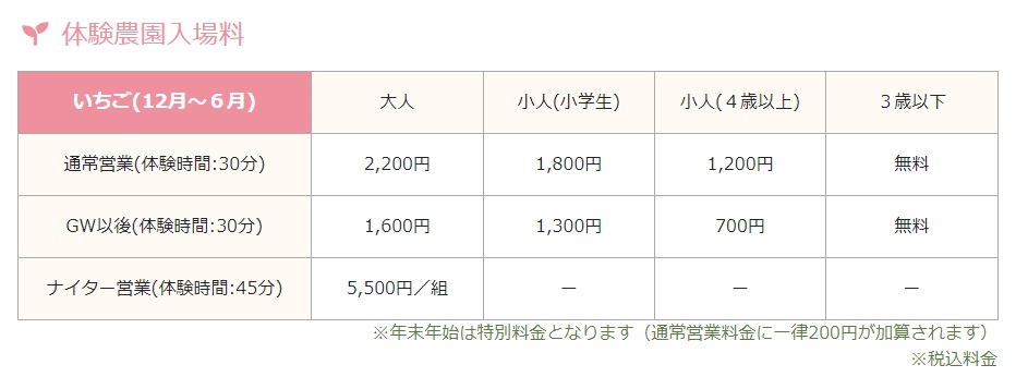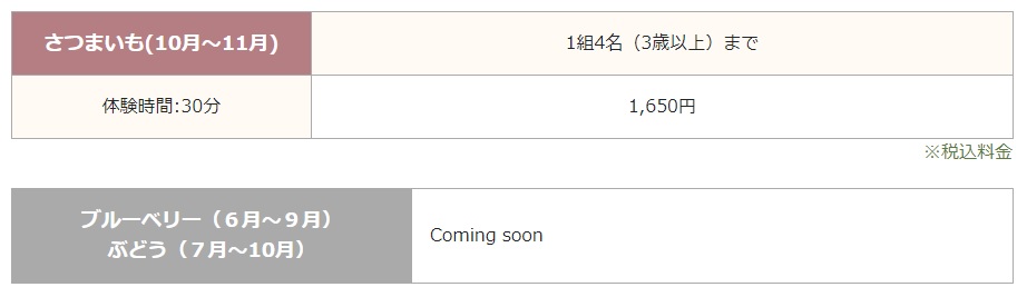 いちご/1,200円~ ( 4歳以上 ) 、さつまいも/1,650円 1組4名 ( 3歳以上 )カテゴリー