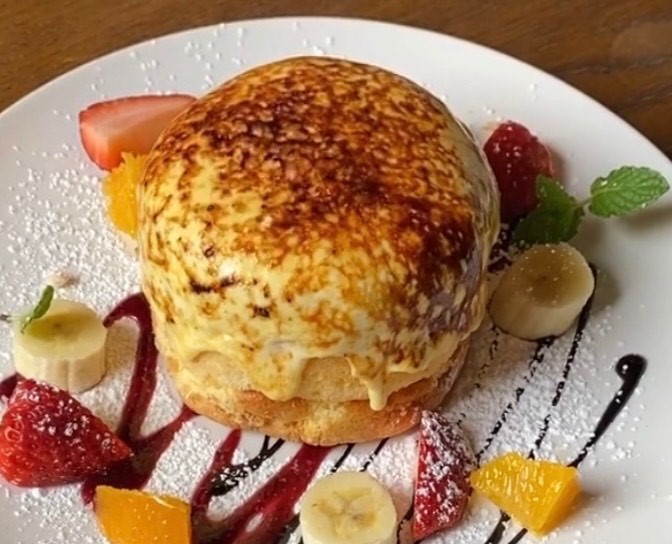 シフォンケーキの上にクリームを焦がしながら全体に流れるパフォーマンスも!